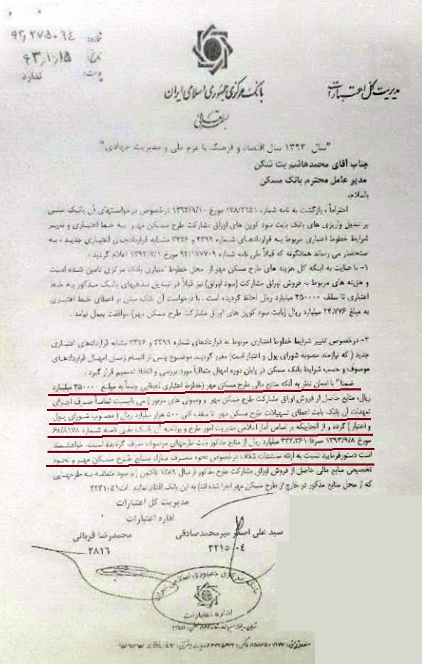 در نامه اداره اعتبارات بانک مرکزی به بانک مسکن در تاریخ ۱۵/۱۰/۹۳ به بت شکن مدیرعامل بانک مسکن آمده است: