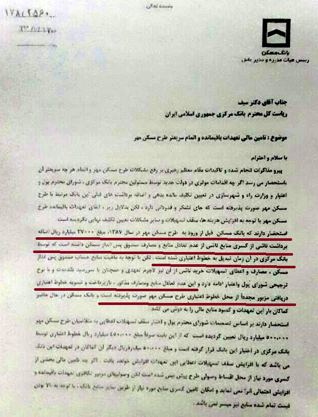 «نظر به انکه منابع مالی طرح مسکن مهر ...می بایست تماماً صرف اجرای تعهدات آن بانک بابت اعطای تسهیلات مسکن مهر تا سقف ۵۰۰ هزار میلیار ریال ... گردد و از آنجاییکه بر اساس نظر اعلامی مدیریت امور طرح و برنامه ان بانک ...صرفاً ۴۳۲،۳۶۱ میلیارد ریال از منابع مذکور بابت طرحهای موصوف صرف گردیده است دستور فرمایید نسبت ارائه مستندات شفاف در خصوص نحوه مصرف مازاد منابع طرح مسکن مهر ... اقدام نماید»
