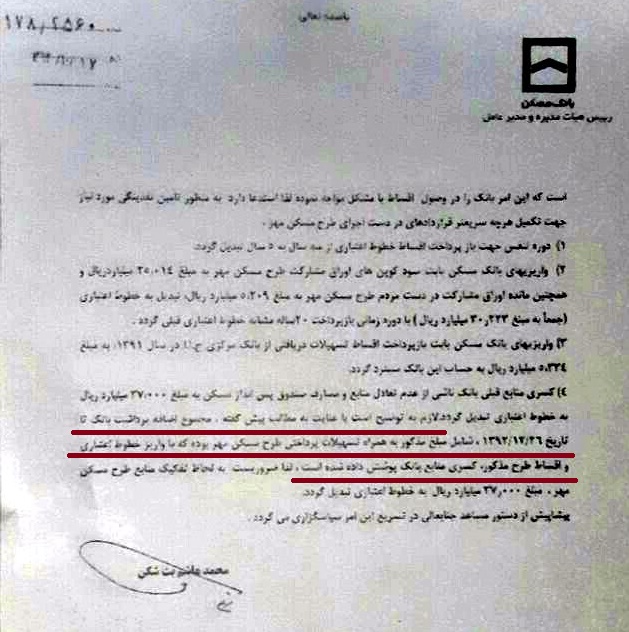 «...بانک مسکن قبل از ورود به طرح مسکن مهر در سال ۱۳۸۷، ۳۷،۰۰۰میلیارد ریال اضافه برداشت ناشی از کسری منابع ... داشته است که در آن زمان تبدیل به خط اعتباری شده و ... تسویه خط اعتباری مزبورمجدداً از محل خطوط اعتباری طرح مسکن مهر صورت پذیرفته است.»