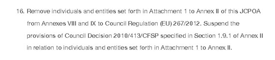 در بند ۱۶.۳ از ضمیمه پنجم این بند آمده است اتحادیه اروپا افراد و نهادهای مندرج در پیوست یک از ضمیمه دوم را از ضمیمه ۸ و ۹ مصوبه اجرایی شورای اروپا (۲۶۷/۲۰۱۲) خارج میکند. مفاد مرتبط با بخش ۱.۹.۱ از ضمیمه دوم که در تصمیم شورای اروپا (۲۰۱۰/۴۱۳) در ارتباط با افراد و نهادها مندرج در پیوست ۱ از ضمیمه دوم را تعلیق میکند.