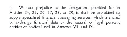 در این قسمت تاکید شده است ارایه خدمات پیام رسانی به افراد و نهادهای مندرج در پیوست ۸ و ۹ ممنوع است. در نتیجه همین بند سوئیفت نیز ارایه خدماتش به بانکهای ایرانی را قطع کرد.