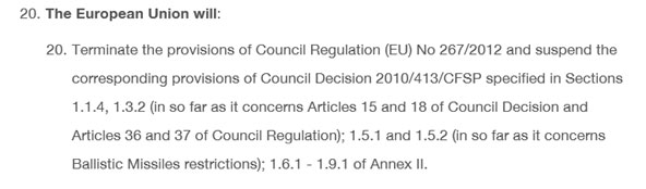 ۵- در ضمیمه پنجم که نقشه اجرای توافقنامه است، در تعهدات اتحادیه اروپا که باید در روز اجرا انجام شود، بند ۱.۱.۴ که مربوط به تحریم خدمات پیام رسانی است، وجود ندارد و برداشته شدن این تحریم در تعهدات اتحادیه اروپا در روز انتقال آمده است. بند ۲۰ از ضمیمه پنجم میگوید: