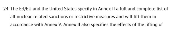 در بند ۲۴ توافق اصلی آمده است که برداشته شدن تحریمها بر اساس ضمیمه پنجم خواهد بود.