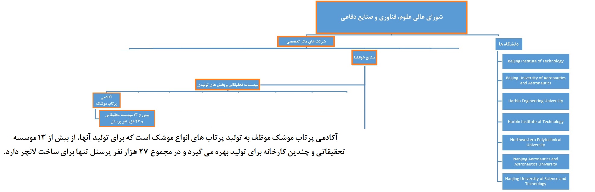 برای نمونه به ساختار تولید لانچر موشک در زیر توجه کنید. مشابه همین ساختار در تمامی حوزه های دفاعی و غیر دفاعی صنعتی چین وجود دارد. ایجاد یک ساختار هماهنگ و کاملا علمی برای تولید محصول. خروجی این مسیر هیچگاه محصول بی کیفیت و خارج از استاندارد نخواهد بود. این ساختار به قدری خوب عمل کرده که یکی از خروجی های آن فرستادن انسان با موشک و فضاپیمای چینی بوده است. مشابه چنین ساختاری را ما در دیگر کشورهای پیشرو صنعتی می بینیم. نمی توان سودای حرکت به سمت دستیابی به تکنولوژی و علوم صنعتی پیشرفته را داشت و بدون یک برنامه ریزی و نقشه راه حرکت کرد.