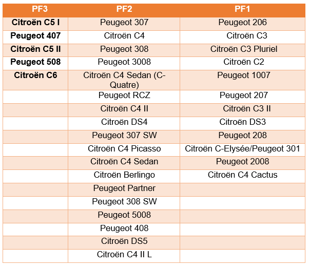2- شرکت های خودروسازی پژو سیترون با توجه به ادغامشان در سال 1976 از پلت فرم های یکسان برای برای توسعه محصولات خود استفاده می نمایند که در جدول ذیل خودروهای تولید شده بر روی پلت فرم های PF1، PF2 و PF3 (پلت فرم دو دهه شرکت پژو سیتروئن) را مشاهده می شود.