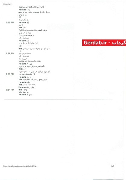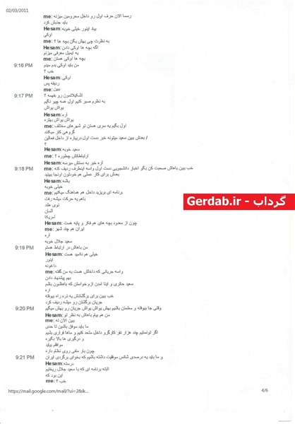 در این گفتگوی اینترنتی که در اواخر سال 1389 انجام شده است، پیرامون برنامههایی مانند ساماندهی برای اقدام مسلحانه علیه نظام، ساماندهی برای ایجاد اغتشاش در کشور و اقدامات تخریبی در سیستمهای رایانه ای وزارت نفت و وزارت اطلاعات و ... بحث میشود.