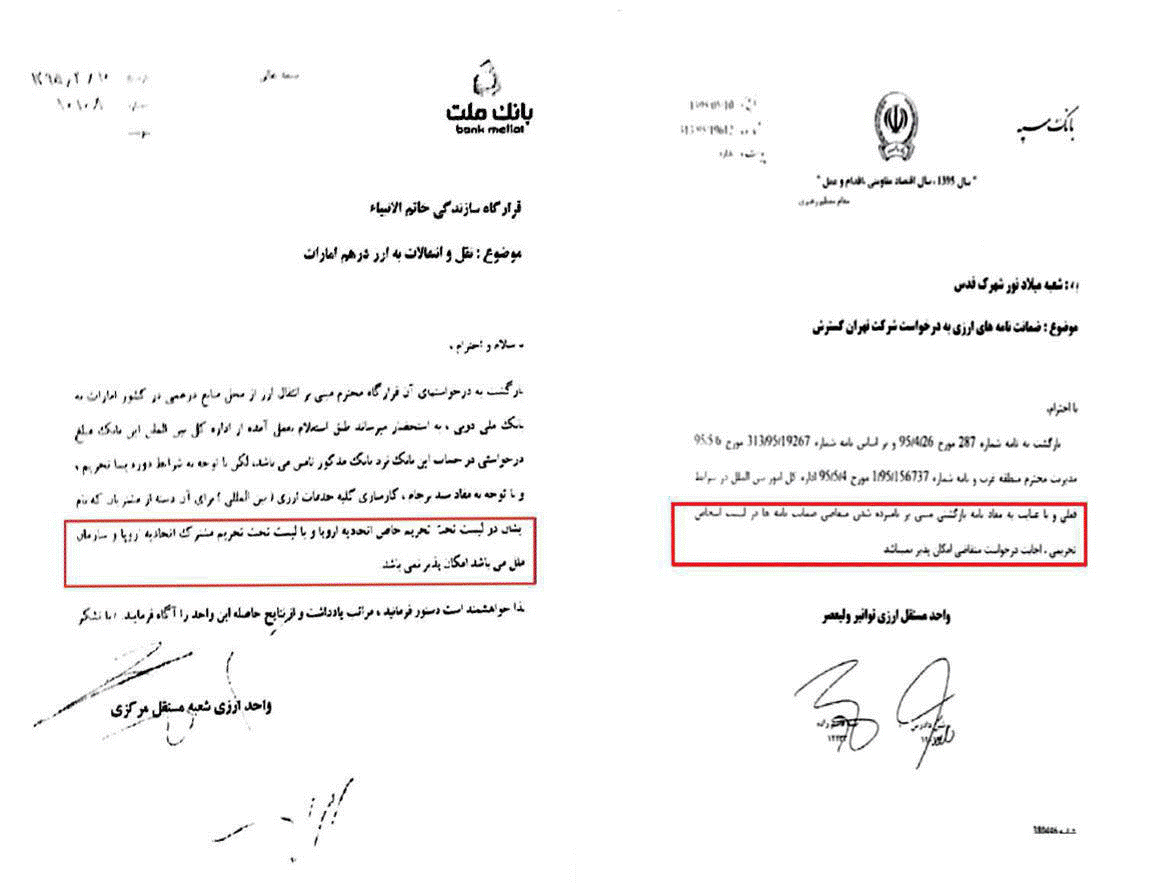 همچنین در نامه بانک ملت که در پاسخ به درخواست قرارگاه خاتمالانبیا (ص) برای نقل و انتقالات ارزی؛ آمده است: «کارسازی کلیه خدمات ارزی (بینالمللی) برای آن دسته از مشتریان که نامشان در لیست تحریم اتحادیه اروپا و یا لیست تحریم مشترک اتحادیه اروپا و سازمان ملل میباشد امکانپذیر نیست.»
