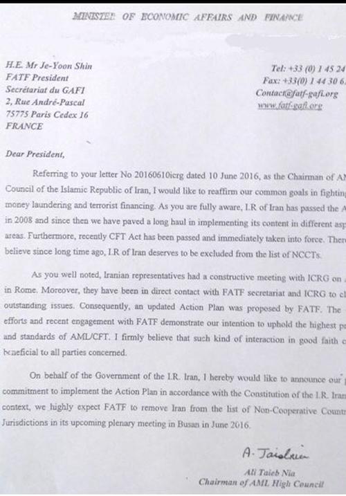 Referring to your letter No 20160610icrg dated 10 June 2016, as the Chairman of AML High Council of the Islamic Republic of Iran, I would like to reaffirm our common goals in fighting against money laundering and terrorist financing. As you are fully aware. I.R of Iran has passed the AML Act in 2008 and since then we have paved a long haul in implementing its content in different aspects and areas. rurthcrmore, recently CFT Act has been passed and immediately taken into force. Therefore we believe since long time ago, I.R of !ran deserves to be excluded from the list of NCCTs.