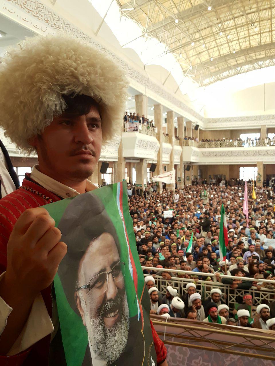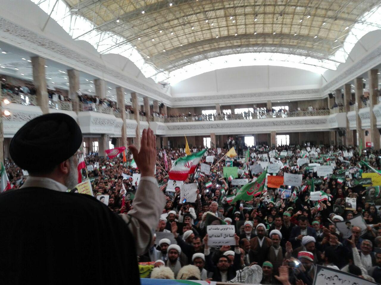 او افزود: خیلی از شماها بزرگوار و دارای شأن و کرامت هستید. من فقط شأنم این است که خدمتگزار باشم.(مردم: ئیسی! رئیسی حمایتت میکنیم)