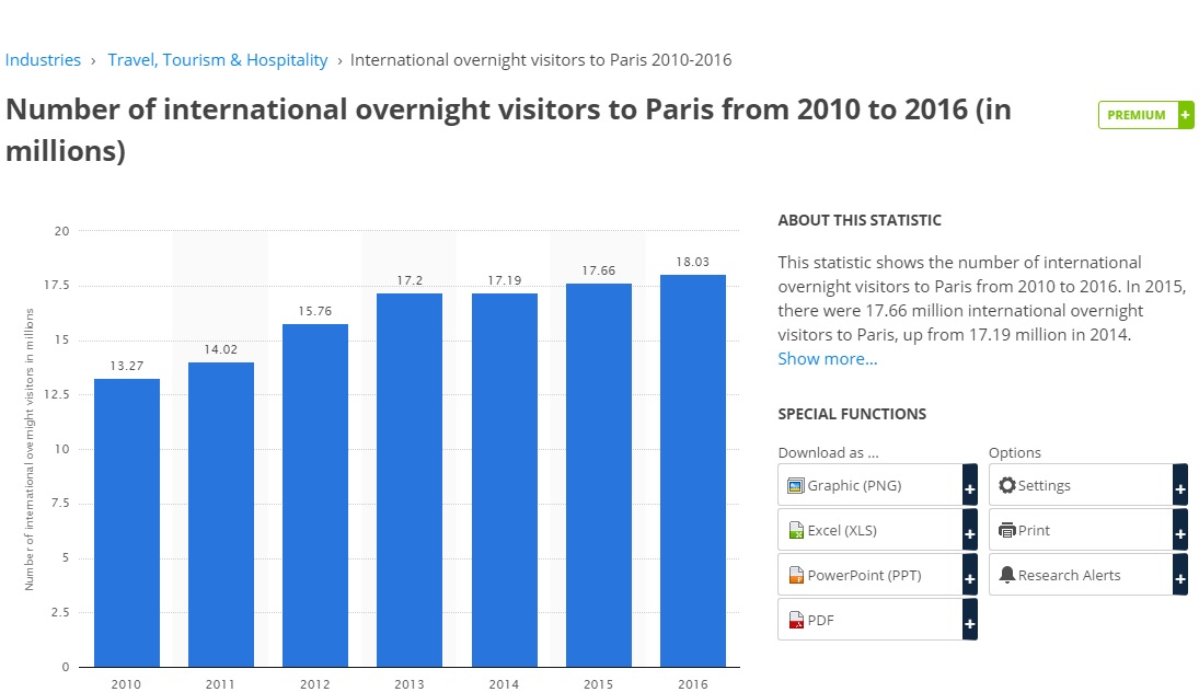 طبق آمارهای ارائه شده توسط منابع رسمی میزان ورود توریست در پاریس در سال گذشته 18 میلیون نفر بوده است. (3)